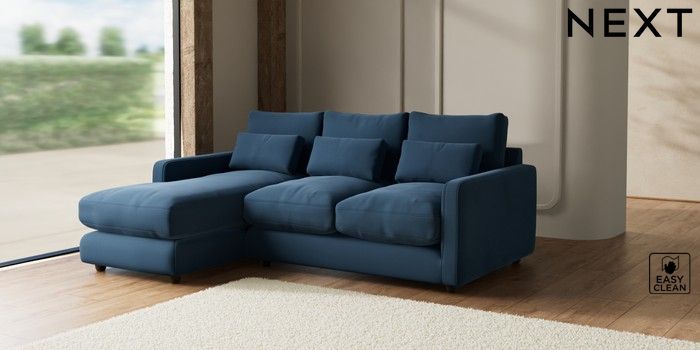 7.2.6 Buy N Premium Farndon Grand Relaxed Sit Medium Sofa Chaise - Left Hand Plush Velvet Easy Clean Airforce Blue Wooden Glide - Mid from the Next UK online shop Click here to use our accessible website