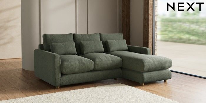 7.2.6 Buy N Premium Farndon Grand Relaxed Sit Medium Sofa Chaise - Right Hand Chunky Texture Mid Forest Green Wooden Glide - Light from the Next UK online shop Click here to use our accessible website