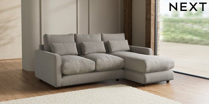 7.2.6 Buy N Premium Farndon Grand Relaxed Sit Medium Sofa Chaise - Right Hand Chunky Weave Dove Grey Wooden Glide - Mid from the Next UK online shop Click here to use our accessible website