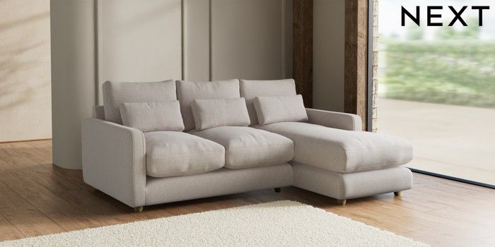 7.2.6 Buy N Premium Farndon Grand Relaxed Sit Medium Sofa Chaise - Right Hand Cotswold Chenille Oyster Wooden Glide - Light from the Next UK online shop Click here to use our accessible website
