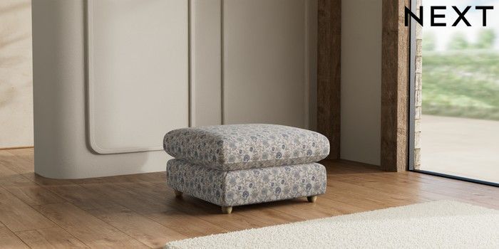 7.3.1 Buy N Premium The Snuggle Grand Footstool Relaxed Linen Look Print Woodblock Floral Blue Wooden Glide - Light from the Next UK online shop