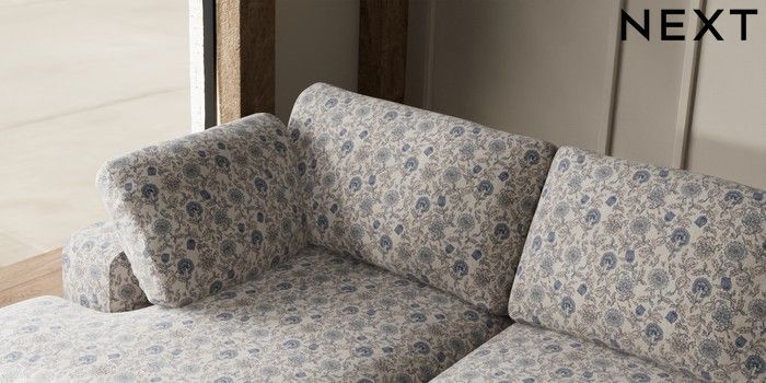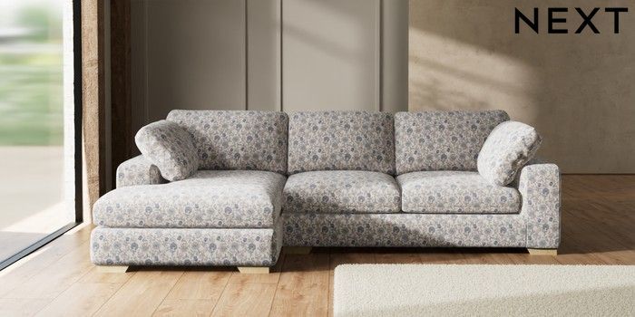 7.3.1 Buy N Premium The Snuggle Grand Large Sofa Chaise - Left Hand Relaxed Linen Look Print Woodblock Floral Blue Large Square Angle - Light from the Next UK online shop