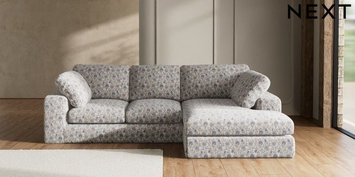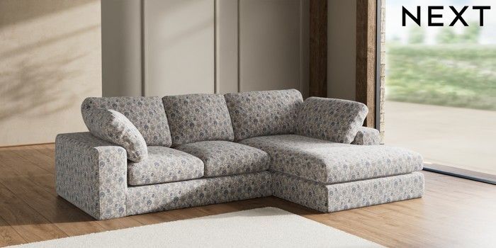 7.3.1 Buy N Premium The Snuggle Grand Medium Corner Chaise - Right Hand Relaxed Linen Look Print Woodblock Floral Blue Wooden Glide - Light from the Next UK online shop