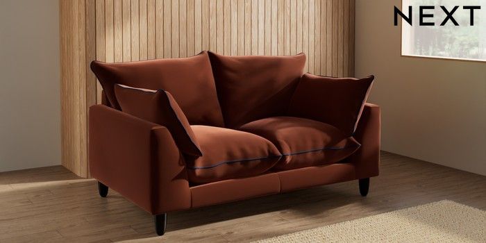 7.3.1 Buy Noa Deep Relaxed Sit 2 Seater Small Sofa Plush Velvet with Contrast Ginger Orange with Navy Blue High Leg - Dark from the Next UK online shop Click here to use our accessible website
