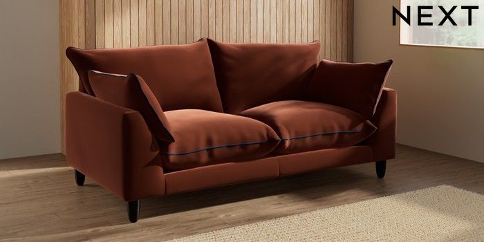 7.3.1 Buy Noa Deep Relaxed Sit 3 Seater Small Sofa Plush Velvet with Contrast Ginger Orange with Navy Blue High Leg - Dark from the Next UK online shop Click here to use our accessible website