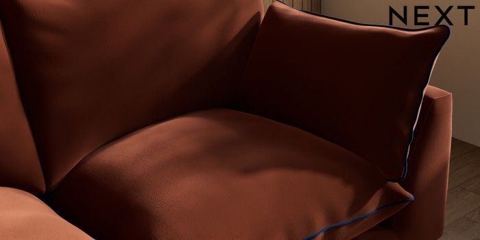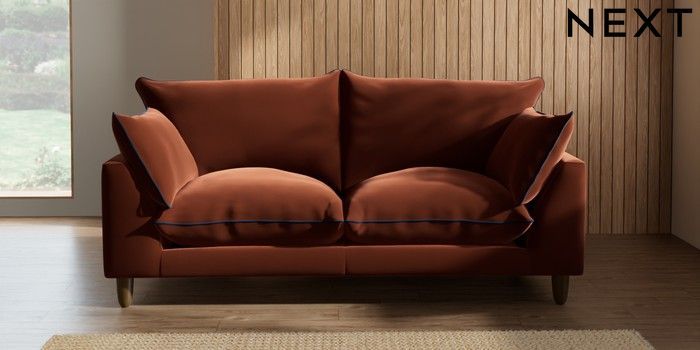 7.3.1 Buy Noa Deep Relaxed Sit 3 Seater Small Sofa Plush Velvet with Contrast Ginger Orange with Navy Blue High Leg - Mid from the Next UK online shop Click here to use our accessible website