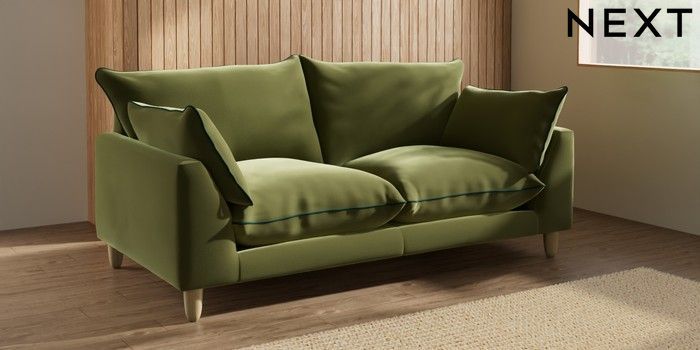 7.3.1 Buy Noa Deep Relaxed Sit 3 Seater Small Sofa Plush Velvet with Contrast Mid Olive Grn with Bottle Grn High Leg - Light from the Next UK online shop Click here to use our accessible website