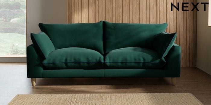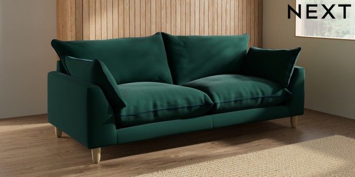 7.3.1 Buy Noa Deep Relaxed Sit 3 Seater Sofa Plush Velvet with Contrast Bottle Green with Navy Blue High Leg - Light from the Next UK online shop Click here to use our accessible website
