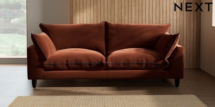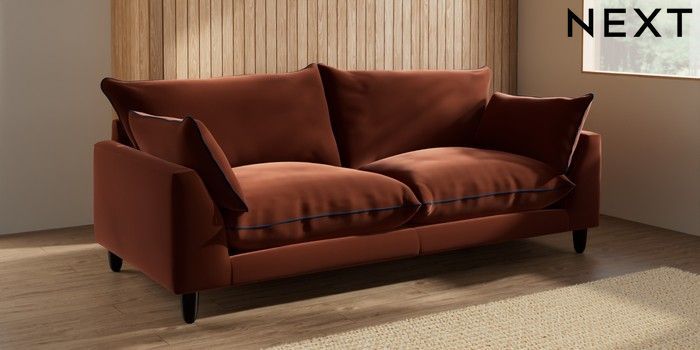 7.3.1 Buy Noa Deep Relaxed Sit 3 Seater Sofa Plush Velvet with Contrast Ginger Orange with Navy Blue High Leg - Dark from the Next UK online shop Click here to use our accessible website