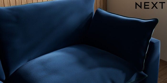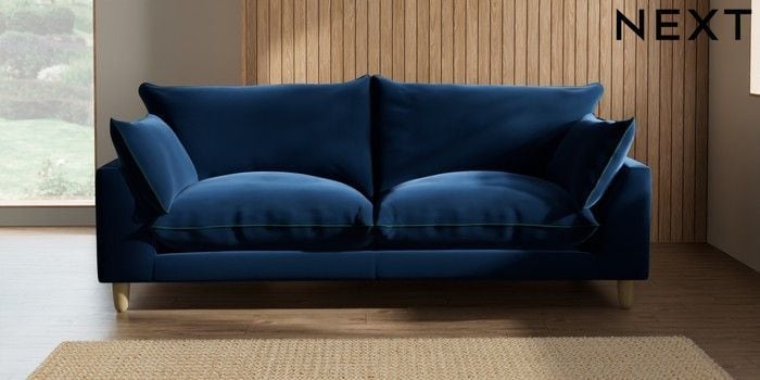 7.3.1 Buy Noa Deep Relaxed Sit 3 Seater Sofa Plush Velvet with Contrast Navy Blue with Bottle Green High Leg - Light from the Next UK online shop Click here to use our accessible website