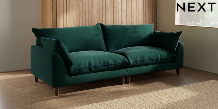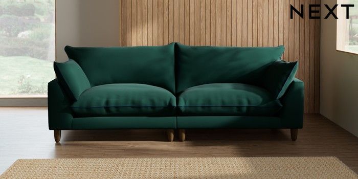 7.3.1 Buy Noa Deep Relaxed Sit 4 Seater Sofa Plush Velvet with Contrast Bottle Green with Navy Blue High Leg - Mid from the Next UK online shop Click here to use our accessible website