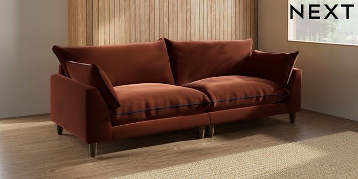 7.3.1 Buy Noa Deep Relaxed Sit 4 Seater Sofa Plush Velvet with Contrast Ginger Orange with Navy Blue High Leg - Mid from the Next UK online shop Click here to use our accessible website