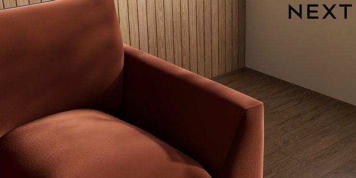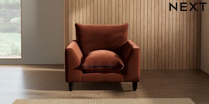 7.3.1 Buy Noa Deep Relaxed Sit Armchair Plush Velvet with Contrast Ginger Orange with Navy Blue High Leg - Dark from the Next UK online shop Click here to use our accessible website