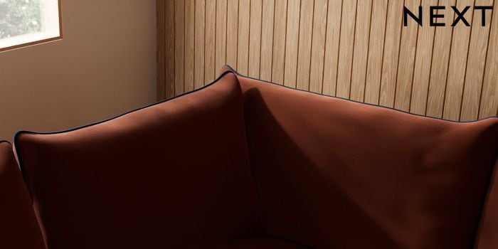 7.3.1 Buy Noa Deep Relaxed Sit Large Corner Sofa - Left Hand Plush Velvet with Contrast Ginger Orange with Navy Blue High Leg - Mid from the Next UK online shop Click here to use our accessible website