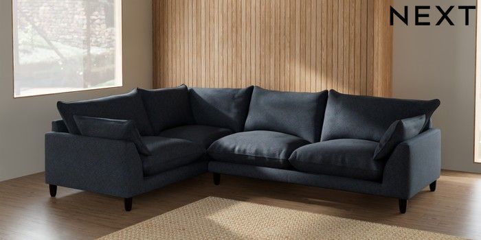 7.2.6 Buy Noa Deep Relaxed Sit Large Corner Sofa - Left Hand Tweedy Chenille Navy Blue High Leg - Dark from the Next UK online shop Click here to use our accessible website