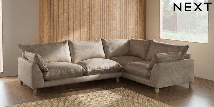 7.2.6 Buy Noa Deep Relaxed Sit Large Corner Sofa - Right Hand Plush Chenille Light Natural High Leg - Light from the Next UK online shop Click here to use our accessible website