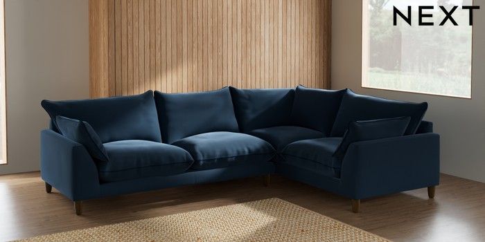 7.3.1 Buy Noa Deep Relaxed Sit Large Corner Sofa - Right Hand Plush Velvet with Contrast Airforce Blue with Navy Blue High Leg - Mid from the Next UK online shop Click here to use our accessible website
