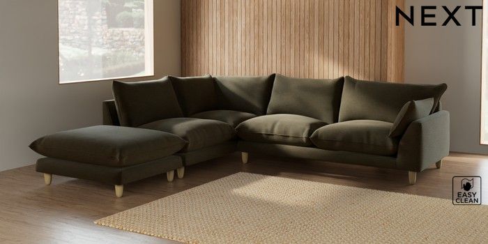 7.2.6 Buy Noa Deep Relaxed Sit Large Open End Corner Chaise - Left Hand Fine Chenille Easy Clean Dark Moss Green High Leg - Light from the Next UK online shop Click here to use our accessible website