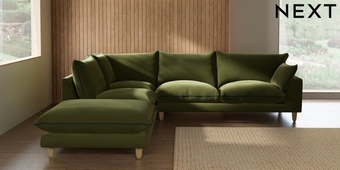7.3.1 Buy Noa Deep Relaxed Sit Large Open End Corner Chaise - Left Hand Plush Velvet with Contrast Mid Olive Grn with Juniper Grn High Leg - Light from the Next UK online shop Click here to use our accessible website