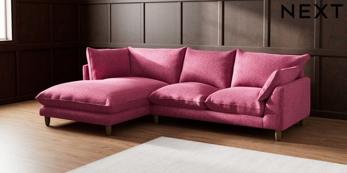 7.2.6 Buy Noa Deep Relaxed Sit Medium Corner Chaise - Left Hand Cotswold Chenille Dark Raspberry Pink High Leg - Light from the Next UK online shop Click here to use our accessible website