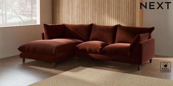 7.2.6 Buy Noa Deep Relaxed Sit Medium Corner Chaise - Left Hand Plush Velvet Easy Clean Ginger Orange High Leg - Light from the Next UK online shop Click here to use our accessible website