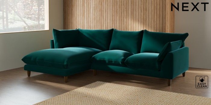7.2.6 Buy Noa Deep Relaxed Sit Medium Corner Chaise - Left Hand Plush Velvet Easy Clean Juniper Green High Leg - Light from the Next UK online shop Click here to use our accessible website