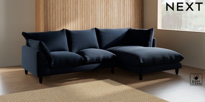 7.2.6 Buy Noa Deep Relaxed Sit Medium Corner Chaise - Right Hand Fine Chenille Easy Clean Dark Navy Blue High Leg - Dark from the Next UK online shop Click here to use our accessible website