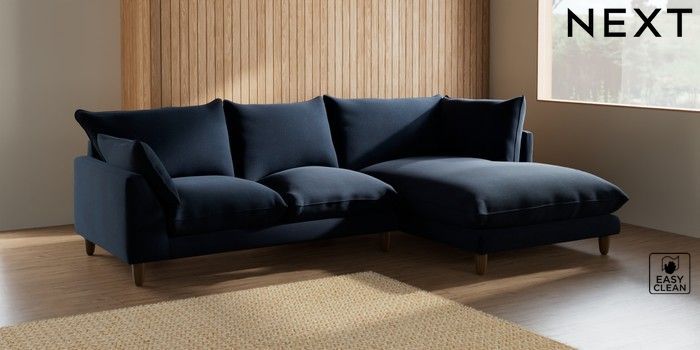7.2.6 Buy Noa Deep Relaxed Sit Medium Corner Chaise - Right Hand Fine Chenille Easy Clean Dark Navy Blue High Leg - Mid from the Next UK online shop Click here to use our accessible website
