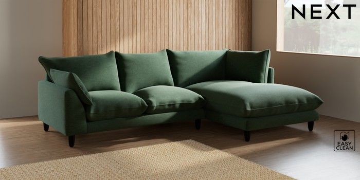 7.2.6 Buy Noa Deep Relaxed Sit Medium Corner Chaise - Right Hand Fine Chenille Easy Clean Mid Khaki Green High Leg - Dark from the Next UK online shop Click here to use our accessible website