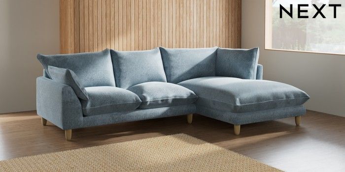 7.2.6 Buy Noa Deep Relaxed Sit Medium Corner Chaise - Right Hand Plush Chenille Light Blue High Leg - Light from the Next UK online shop Click here to use our accessible website