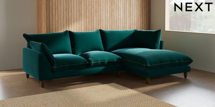 7.3.1 Buy Noa Deep Relaxed Sit Medium Corner Chaise - Right Hand Plush Velvet with Contrast Juniper Grn with Mid Olive Grn High Leg - Mid from the Next UK online shop Click here to use our accessible website