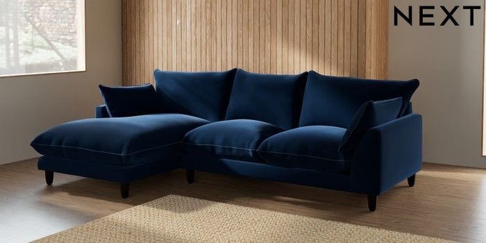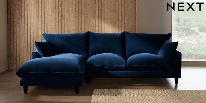 7.3.1 Buy Noa Deep Relaxed Sit Medium Sofa Chaise - Left Hand Plush Velvet with Contrast Navy Blue with Airforce Blue High Leg - Dark from the Next UK online shop Click here to use our accessible website