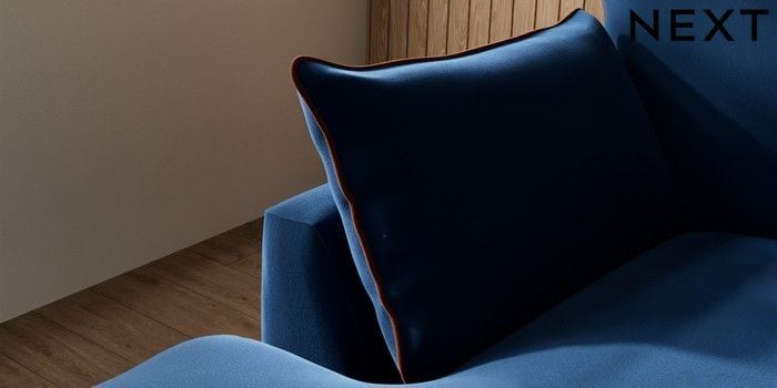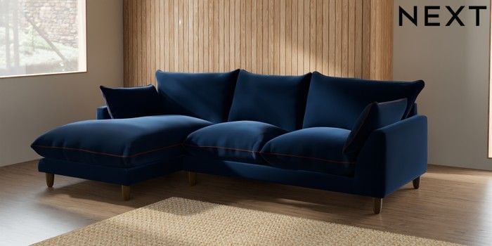 7.3.1 Buy Noa Deep Relaxed Sit Medium Sofa Chaise - Left Hand Plush Velvet with Contrast Navy Blue with Ginger Orange High Leg - Mid from the Next UK online shop Click here to use our accessible website