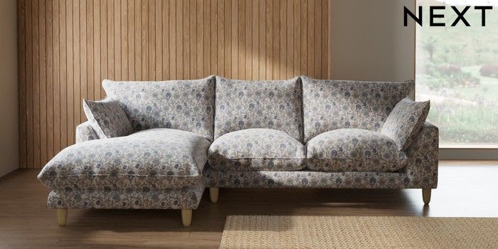 7.3.1 Buy Noa Deep Relaxed Sit Medium Sofa Chaise - Left Hand Relaxed Linen Look Print Woodblock Floral Blue High Leg - Light from the Next UK online shop Click here to use our accessible website