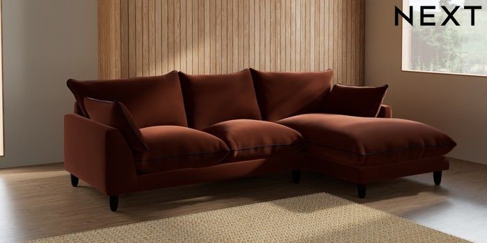 7.3.1 Buy Noa Deep Relaxed Sit Medium Sofa Chaise - Right Hand Plush Velvet with Contrast Ginger Orange with Navy Blue High Leg - Dark from the Next UK online shop Click here to use our accessible website