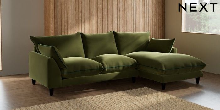 7.3.1 Buy Noa Deep Relaxed Sit Medium Sofa Chaise - Right Hand Plush Velvet with Contrast Mid Olive Grn with Juniper Grn High Leg - Dark from the Next UK online shop Click here to use our accessible website