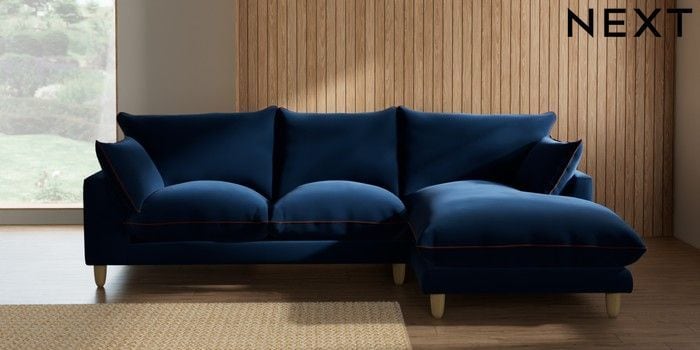 7.3.1 Buy Noa Deep Relaxed Sit Medium Sofa Chaise - Right Hand Plush Velvet with Contrast Navy Blue with Ginger Orange High Leg - Light from the Next UK online shop Click here to use our accessible website