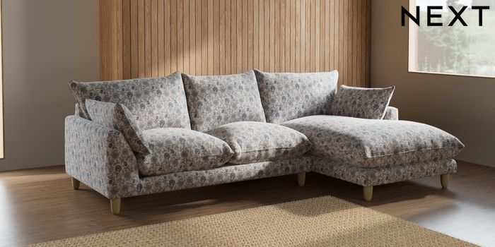 7.3.1 Buy Noa Deep Relaxed Sit Medium Sofa Chaise - Right Hand Relaxed Linen Look Print Woodblock Floral Blue High Leg - Light from the Next UK online shop Click here to use our accessible website