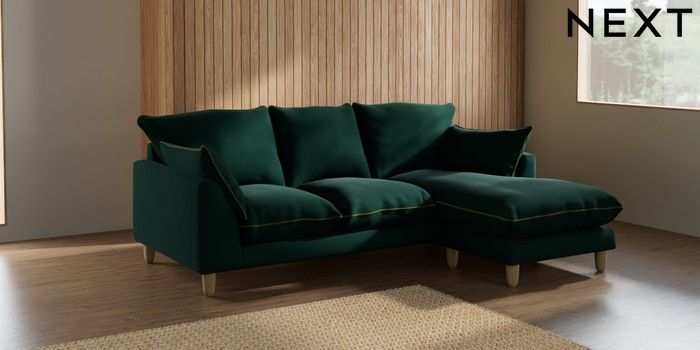 7.3.1 Buy Noa Deep Relaxed Sit Small Sofa Chaise - Universal Plush Velvet with Contrast Bottle Grn with Mid Olive Grn High Leg - Light from the Next UK online shop Click here to use our accessible website