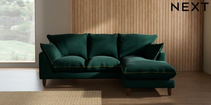 7.3.1 Buy Noa Deep Relaxed Sit Small Sofa Chaise - Universal Plush Velvet with Contrast Bottle Grn with Mid Olive Grn High Leg - Mid from the Next UK online shop Click here to use our accessible website