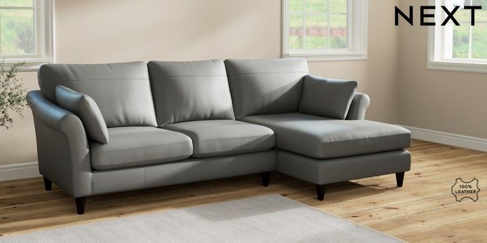 7.2.6 Buy Oakham Leather Medium Sofa Chaise - Right Hand Columbia French Grey Low Conical - Dark from the Next UK online shop Click here to use our accessible website
