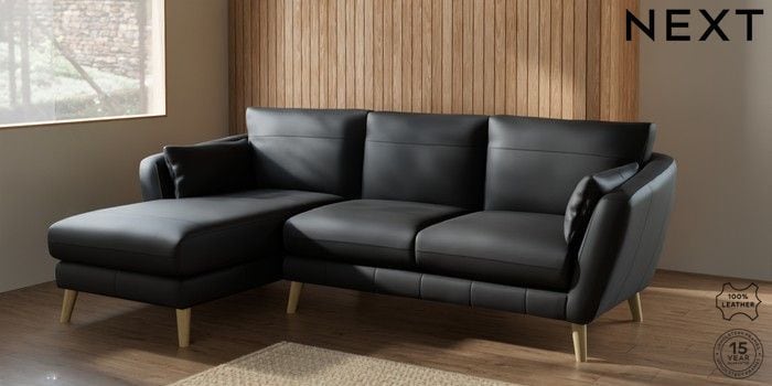 6.12.1 Buy Orlo Leather Medium Sofa Chaise - Left Hand Columbia Black Retro Tapered - Light from the Next UK online shop Click here to use our accessible website