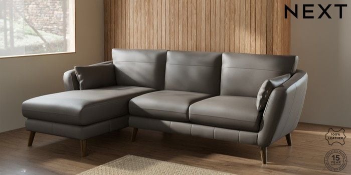 6.12.1 Buy Orlo Leather Medium Sofa Chaise - Left Hand Turin Leather French Grey Retro Tapered - Mid from the Next UK online shop Click here to use our accessible website