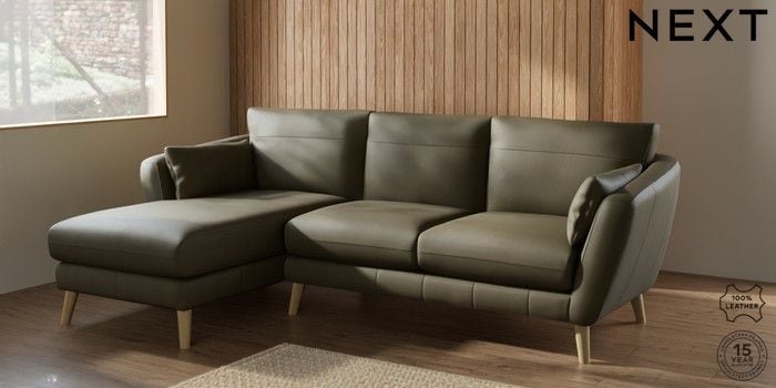 6.12.1 Buy Orlo Leather Medium Sofa Chaise - Left Hand Turin Leather Moss Green Retro Tapered - Light from the Next UK online shop Click here to use our accessible website