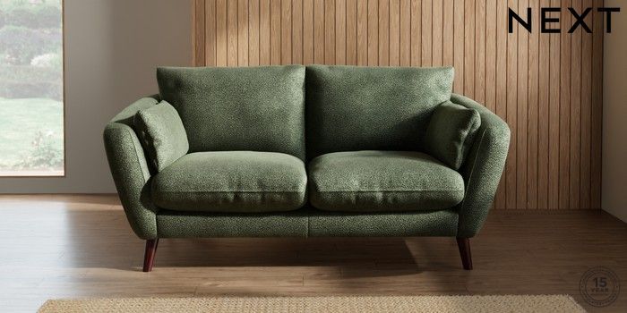 6.12.1 Buy Orlo Relaxed Sit 3 Seater Small Sofa Boucle Chenille Dark Moss Green Retro Tapered - Dark Brown from the Next UK online shop Click here to use our accessible website