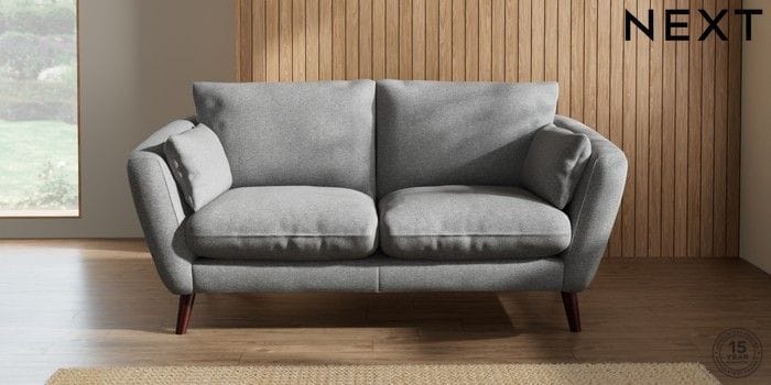 6.12.1 Buy Orlo Relaxed Sit 3 Seater Small Sofa Chunky Weave Mid Grey Retro Tapered - Dark Brown from the Next UK online shop Click here to use our accessible website