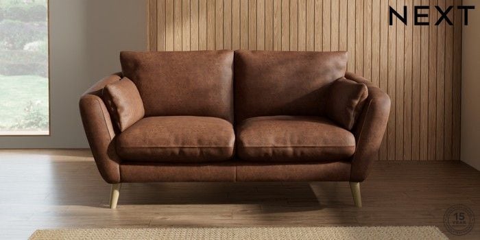 6.12.1 Buy Orlo Relaxed Sit 3 Seater Small Sofa Monza Faux Leather Easy Clean Chestnut Brown Retro Tapered - Light from the Next UK online shop Click here to use our accessible website