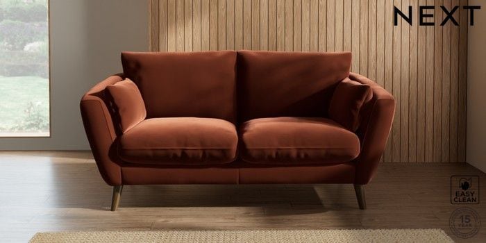 6.12.1 Buy Orlo Relaxed Sit 3 Seater Small Sofa Plush Velvet Easy Clean Ginger Orange Retro Tapered - Mid from the Next UK online shop Click here to use our accessible website