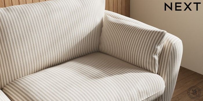7.3.1 Buy Orlo Relaxed Sit 3 Seater Sofa Chenille Stripe Natural Retro Tapered - Dark from the Next UK online shop Click here to use our accessible website
