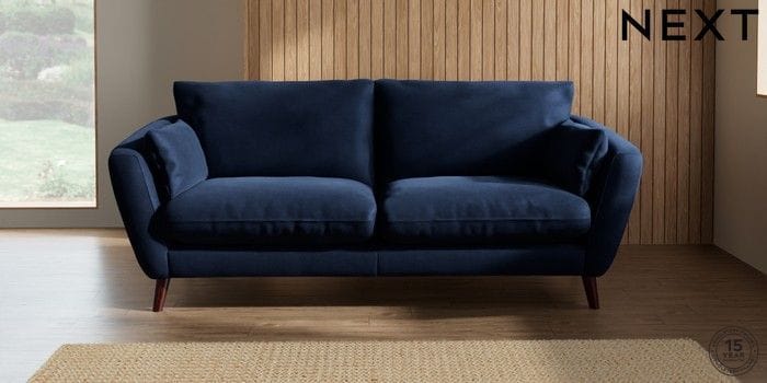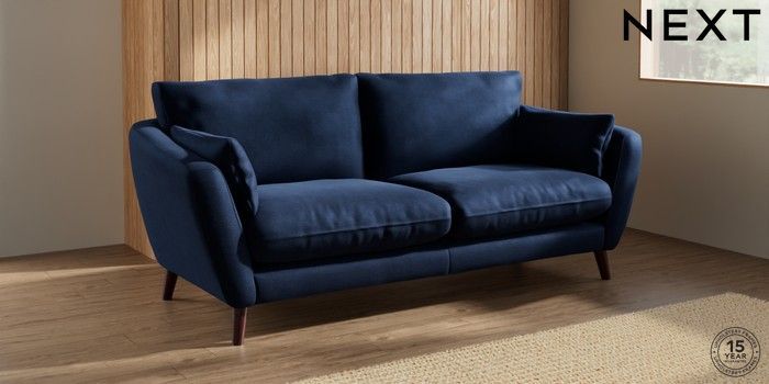 6.12.1 Buy Orlo Relaxed Sit 3 Seater Sofa Luxe Chenille Navy Blue Retro Tapered - Dark Brown from the Next UK online shop Click here to use our accessible website